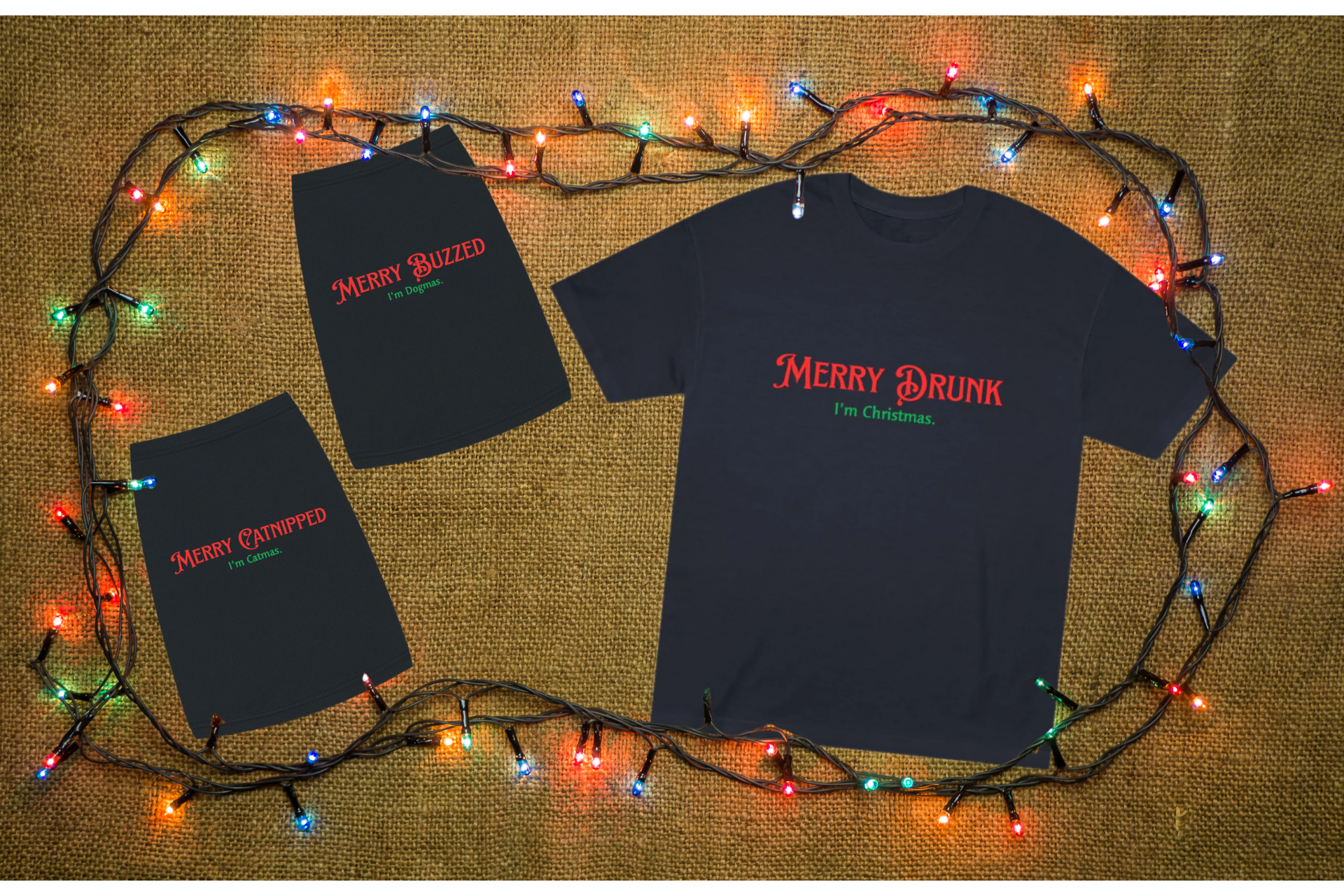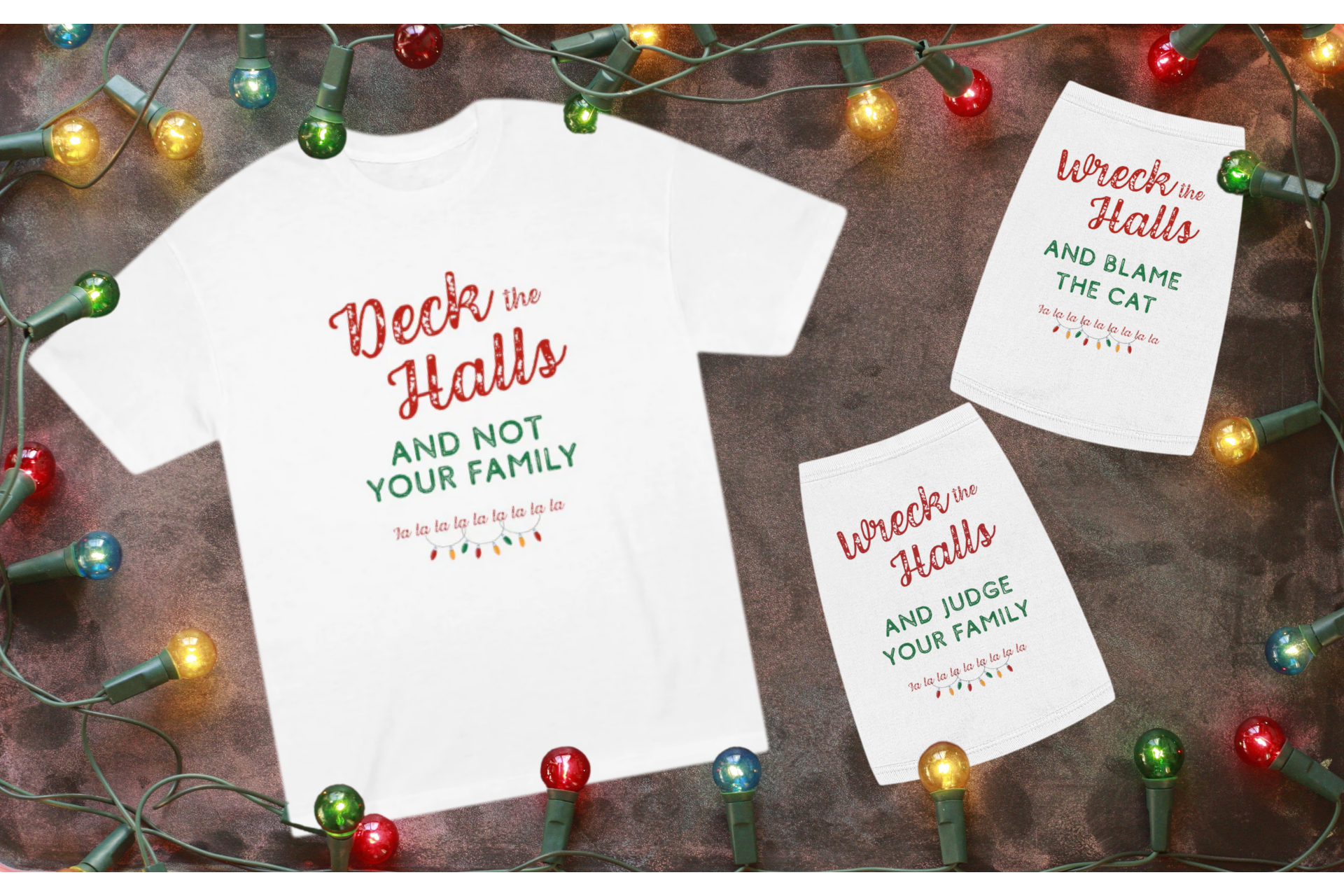 Matching holiday tees for sarcastic humans and their judgmental pets.