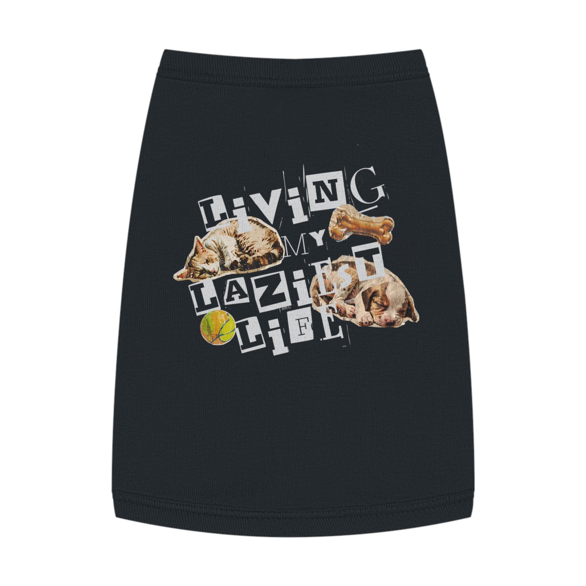 This tank is for the pets who snooze through your meetings, judge your productivity, and have fully committed to a lifestyle of lounge. With its ransom-note lettering and scrapbook-style graphics, “Living My Laziest Life” fits cats and dogs who live for vibes and naps — not responsibilities.