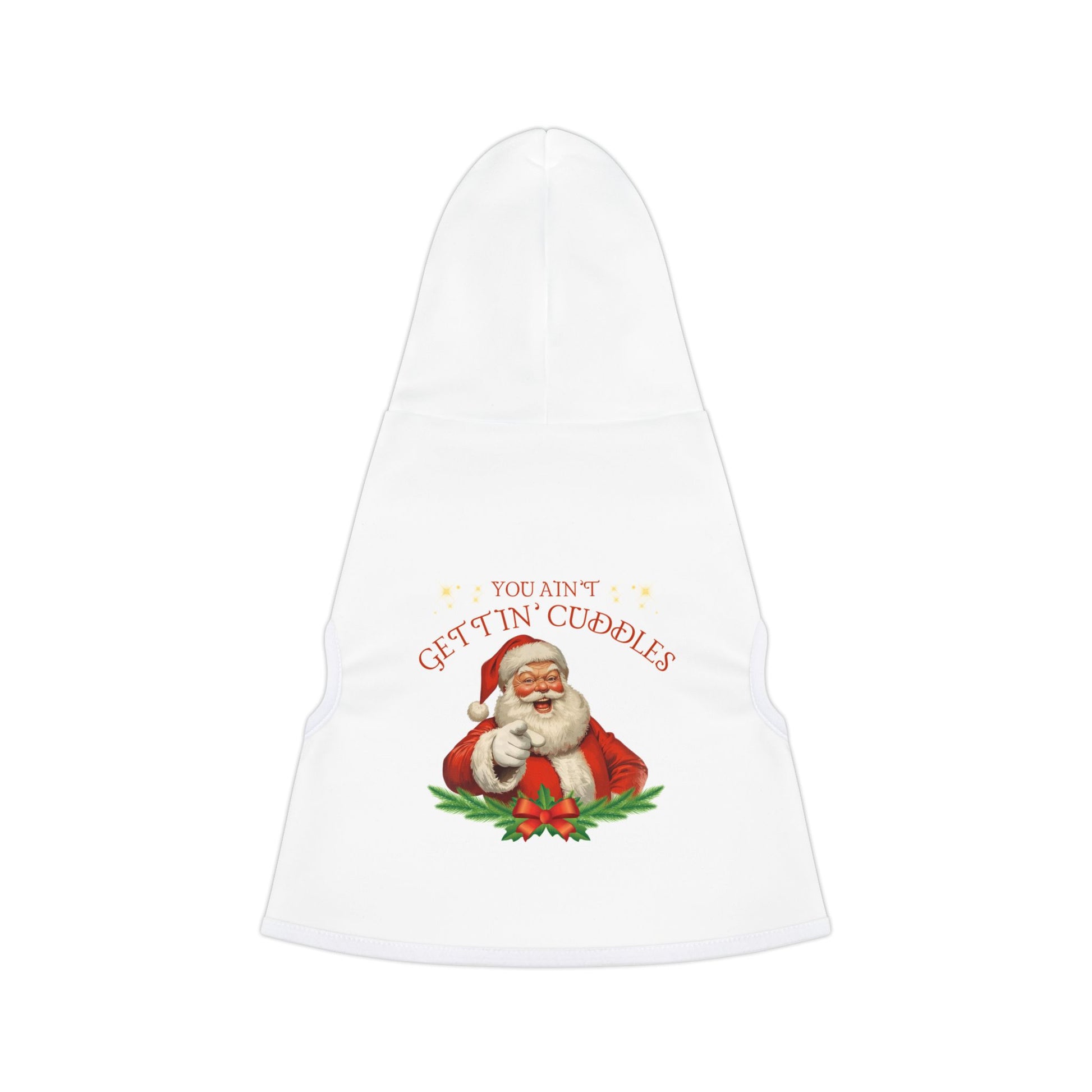 Your cat heard Santa’s laugh and took it personally. This hoodie declares: “You Ain’t Gettin’ Cuddles.” Perfect for the feline who keeps affection strictly on their terms. Match it with the human “You Ain’t Gettin’ Sh*t” hoodie for a purrfectly passive-aggressive holiday pair.